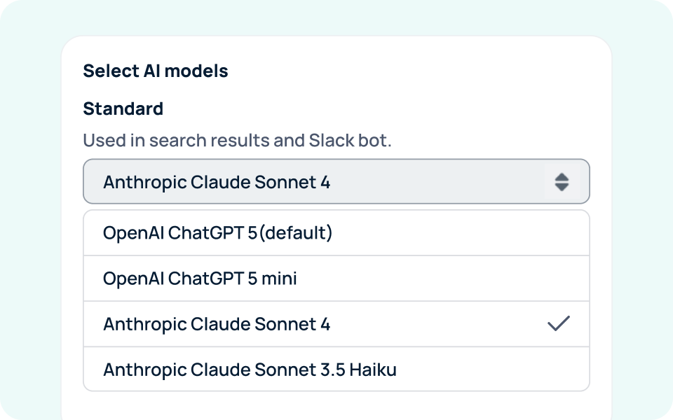 We’re taking GoAI to the next level with new advanced large language model (LLM) options. You can now choose between GPT‑5, Claude Sonnet, and Haiku to power your search results and Slack bot answers.
